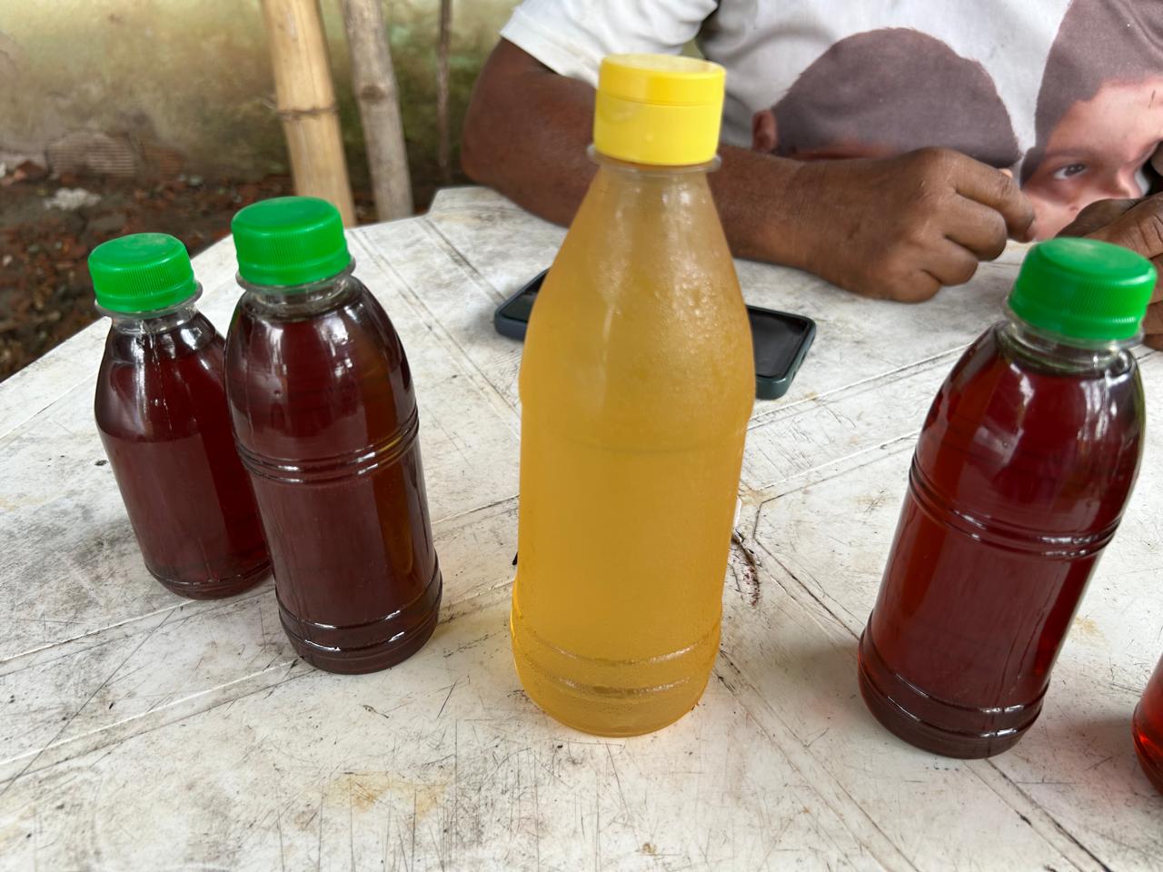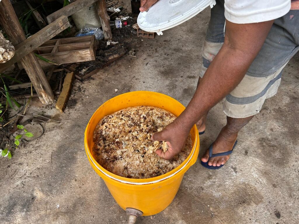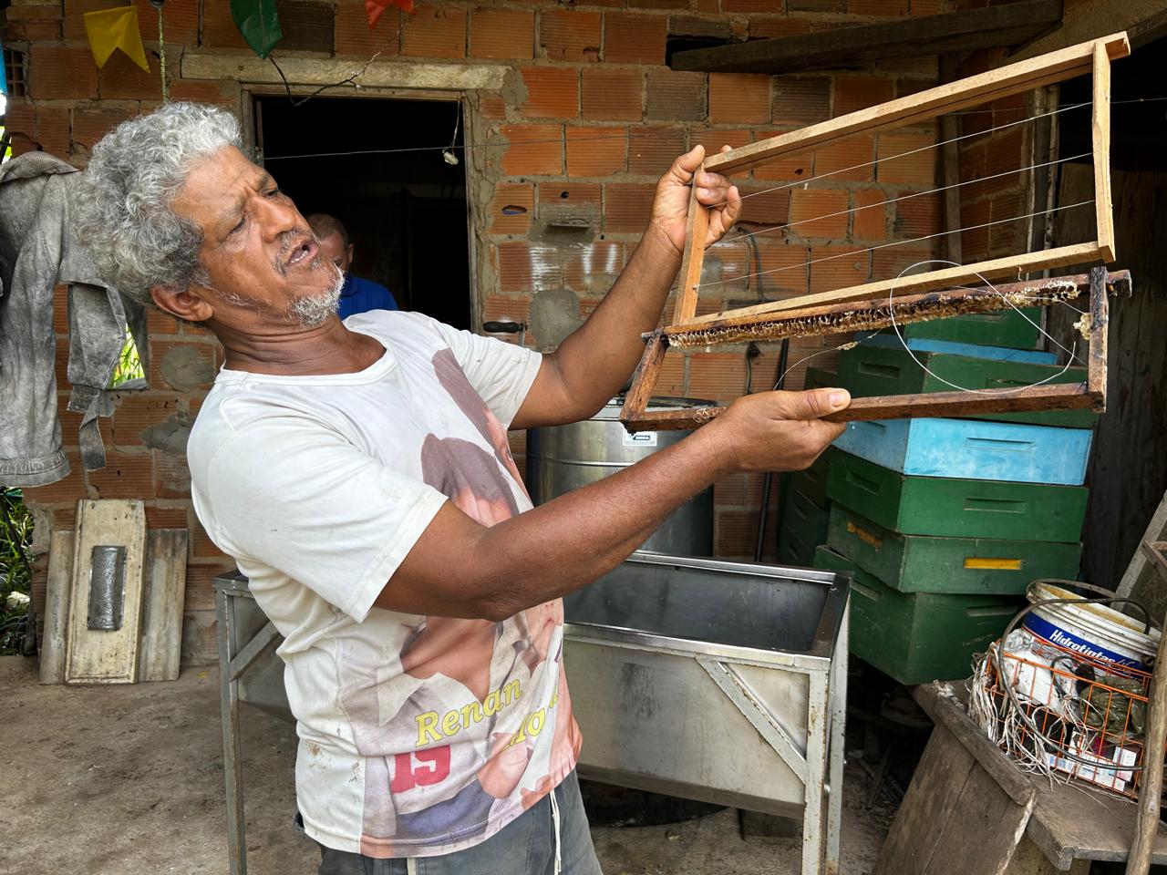 “Temos o mel original da uruçu, o nosso tem ótima qualidade. E outros são méis silvestres. Tem muitas plantas que as abelhas são responsáveis pela polinização aqui: milho, amendoim, acerola, todo tipo de plantação. O coqueiro é um grande fornecedor de pólen para as abelhas, para a composição da geleia real, que alimenta a rainha. O Jacarecica II é muito rico! Com a polinização das abelhas, não tem fruto xoxo nem ‘pêca’, é completinho. Quando o milharal está alto, as abelhas vão polinizando”, relata Eloi Francisco. Sua produção anual de mel varia entre 400 e 600 litros.