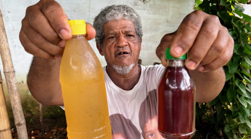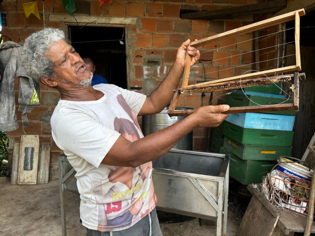 “Temos mais de 50 espécies, produzindo o pólen e o néctar, produzindo o mel completo. As abelhas têm acesso a várias coisas diferentes, como jurema, que dá a ‘própolis verde’, e diversas outras plantas. Sou pioneiro em plantar árvores, aqui”, complementa Eloi Francisco, ao acrescentar que, em breve, quer ampliar o seu plantel de abelhas criando colmeias das espécies mandassaia e jataí.