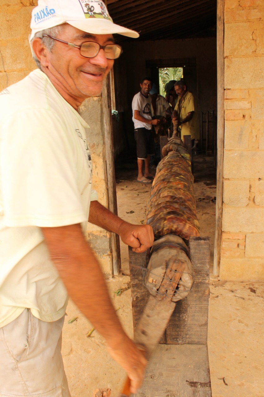 Logo em seguida, o fumo é triturado, prensado e enrolado. Assim, inicia-se uma segunda etapa, que o agricultor Antônio Carvalho chama de processo de ‘cura do fumo’. “Pegamos o rolo triturado e prensado e colocamos no sol; depois de um tempo, viramos de volta para o sol e assim sucessivamente. Desse jeito, ele vai curando, ficando mais escuro e com o cheiro mais forte. O ponto de cura ideal é quando o rolo do fumo está completamente duro, seco e na coloração preta. Geralmente ficam expostos ao sol por um período de 60 a 90 dias”, afirma. Após todo este processo, o fumo é comercializado em cordas, que formam grandes rolos. Em 2019, o preço do quilo do fumo beneficiado alcançou R$ 15, e R$ 4 o quilo da folha entregue aos produtores que fazem a cura.