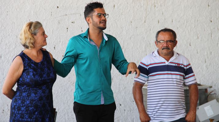 José Raimundo Simão e Fontes e outro produtor irrigante do Perímetro Piauí. Ele plantou seu milho há 50 dias, em uma área de 0,82ha. Ele aproveitou da irrigação pública para também investir na produtividade e diminuição de custos com mão de obra, eliminando o processo manual de adubação pós-plantio. Para tal, utiliza mangueiras de gotejo alimentadas por um sistema de ‘fertirrigação’, onde os nutrientes necessários ao desenvolvimento da planta vão diluídos na água de irrigação. Para o agricultor, dispor de milho para vender antes dos produtores convencionais, que plantam no sequeiro, ajuda muito na rentabilidade do cultivo. “Tem quadro que em São João é melhor e antes de São João é melhor ainda”, justifica.